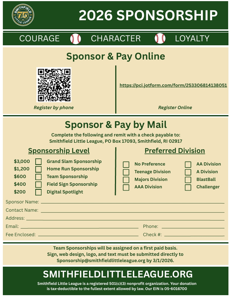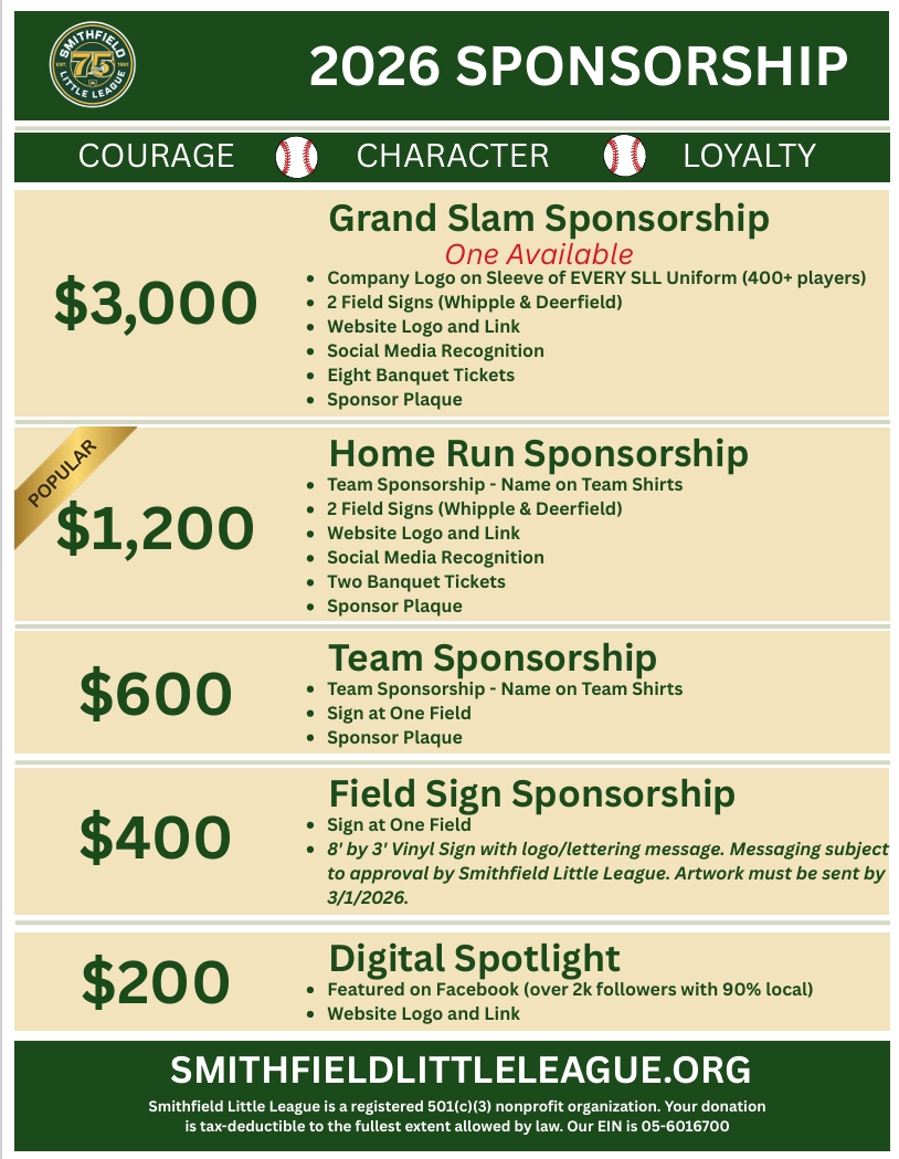 As we gear up for an exciting 2026 season, Smithfield Little League is thrilled to announce our sponsorship opportunities. Your support has been instrumental in shaping the lives of our young players and helping our league achieve remarkable milestones. By becoming a sponsor, you'll not only be supporting the growth and development of our players but also gaining visibility within our community. We invite you to be part of our journey and make a meaningful impact.